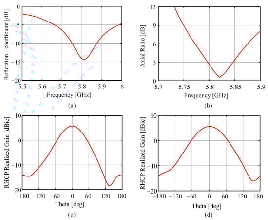 Simulated results of the patch of unit cell: (a) reflection coefficient, (b) AR, (c) RHCP realized gain in = plane, and (d) RHCP realized gain in = plane.