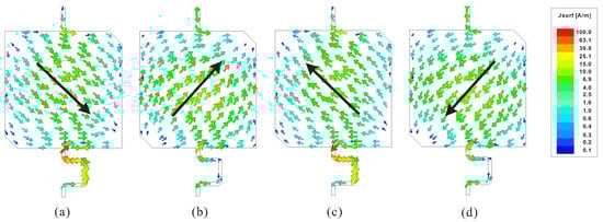 Simulated surface current distributions of the patch of the unit cell with period T at 5.84 GHz: (a) t = 0, (b) t = , (c) t = , and (d) t = .