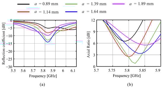Parameter study of the unit cell for varying a: (a) reflection coefficient, (b) AR.