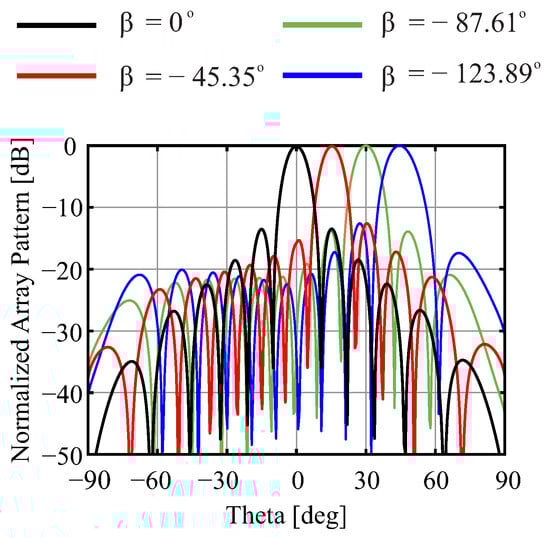Equation (1) represents the array factor of a linear array (), where signifies the phase difference of each element, with N being the element number of the linear array, k the wave number, d the distance between elements, the angle with respect to the array axis, and the progressive phase shift applied to the elements []. N is 12, and the distance between antenna elements is kept at 25 mm , where is the free space wavelength at 5.84 GHz) to prevent grating lobes and maintain a compact array. At 5.84 GHz, to achieve broadside radiation and beam tilting angles of , , and with respect to the array axis, the values are calculated in ascending order of beam tilting angles as , , , and .