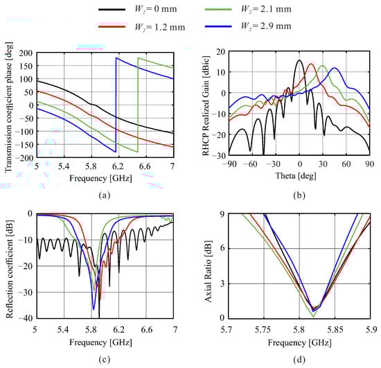 Simulated results for different : (a) phase of the transmission coefficient of the unit cell, (b) RHCP realized gain patterns of the series-fed antennas at 5.84 GHz, in = plane, (c) reflection coefficient of the series-fed antennas, and (d) axial ratio of the series-fed antennas at each beam tilting angle.