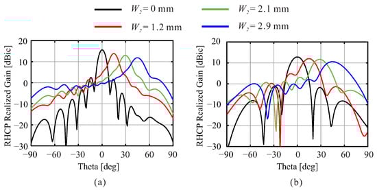 Figure 8 shows simulated RHCP realized gain patterns for values at 5.84 GHz in the = plane, delineating the performance characteristics of two linear array antennas with a varying number of the proposed antenna’s unit cells. The 112 series-fed array antennas shown in Figure 8a feature a sharper main lobe with higher gain and lower sidelobe levels compared to the 16 series-fed array displayed in Figure 8b. As the gain increases, the radiation pattern of the 112 series-fed array exhibits a narrower beamwidth than the 16 series-fed array. Specifically, for the largest tilted angle at = mm, the HPBW for the 112 series-fed array is , while the 16 series-fed array has a HPBW of , resulting in a difference of .