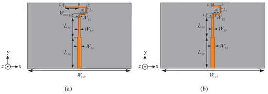 Figure 9 shows the impedance-matching network configurations of the proposed antennas, including a broadside and beam-tilted antenna design. The feed line at the input port is a 50 microstrip line with mm and mm for connection with the coaxial connector. A quarter wavelength transformer with mm (0.25 , where is the guided wavelength at 5.84 GHz) and mm is inserted to match the impedance between the 50 feed line and 100 U-shaped bend transmission line. For the broadside series-fed antenna, an open stub with mm (0.16 ) is introduced between the first radiating patch and the quarter wavelength transformer (Figure 9a) to achieve conjugate matching, effectively tuning the antenna’s impedance.
