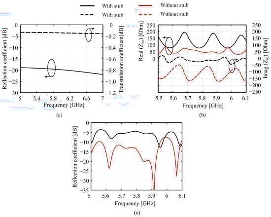 Figure 10 shows the simulated impedance characteristics of the matching network. Figure 10a shows the reflection coefficient and transmission coefficient of the impedance-matching networks of beam-tilted antenna. As shown in Figure 10b, for the broadside series-fed antenna without the matching network and open stub, the resistance of the input impedance is around 100 , and the reactance of the input impedance is −100 at the operating frequency due to the capacitive effect of each radiating patch. With the presence of the matching network and open stub, the resistance of the input impedance is transformed to 50 , and the reactance of the input impedance decreases to nearly zero at the operating frequency. Figure 10c shows the reflection coefficient of the broadside series-fed antenna. With the matching network and open stub, the reflection coefficient is improved from −5 dB to −19 dB.