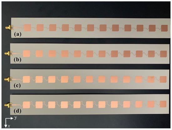 Photographs of the fabricated series-fed antennas prototype: (a) broadside antenna, (b) = beam-tilted antenna, (c) = beam-tilted antenna, and (d) = beam-tilted antenna.