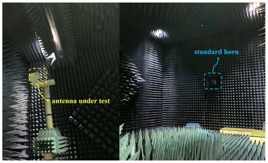 To prove the design of the proposed series-fed antennas, prototypes of each proposed antenna according to the beam tilting angle were manufactured, as shown in Figure 11. The manufactured prototype antennas have a size of (6.220.780.015, where is the free space wavelength at 5.84 GHz). The reflection coefficient was measured with an Agilent E8363B RF network analyzer. The AR and the radiation pattern were measured in an anechoic chamber designed for far-field measurements. A Linear Polarization (LP) standard gain horn antenna and antenna rotating technology were employed for testing, as shown in Figure 12.
