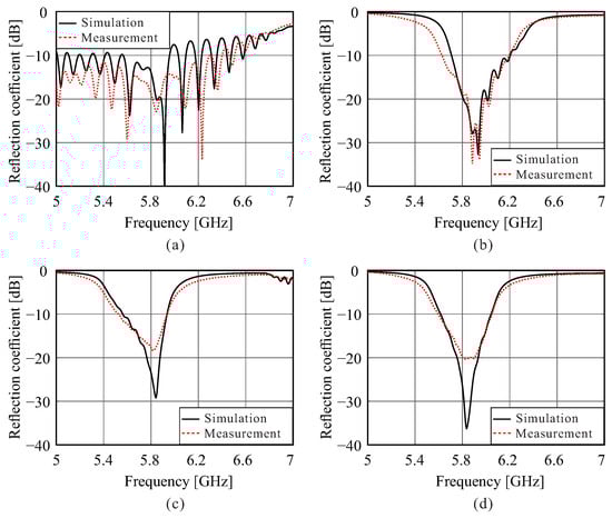 Simulated and measured reflection coefficient of the proposed series-fed antennas: (a) broadside antenna, (b) = beam-tilted antenna, (c) = beam-tilted antenna, and (d) = beam-tilted antenna.