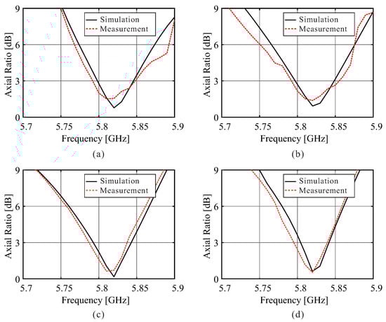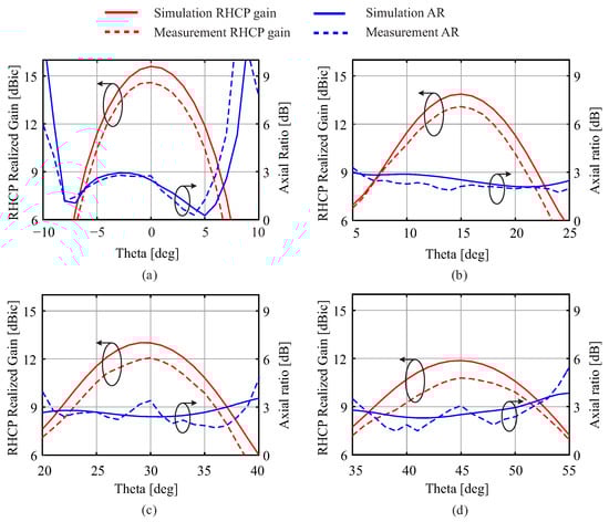 Simulated and measured axial ratio of the proposed series-fed antennas: (a) broadside antenna, (b) = beam-tilted antenna, (c) = beam-tilted antenna, and (d) = beam-tilted antenna.