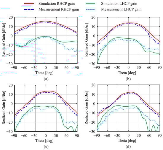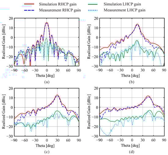 Figure 15 shows simulated and measured results of realized gain patterns of the proposed series-fed antennas at 5.84 GHz. Each subplot represents different beam tilt angles of each tilted antenna, comparing RHCP and left-hand circular polarization (LHCP) gains in the = plane. Figure 15a is realized gain patterns of the broadside antenna, while Figure 15b–d shows realized gain patterns of antennas with 15°, 30°, and 45° beam tilts, respectively. There is a good correlation between the simulated RHCP and LHCP gains (solid and dotted lines) and the measured RHCP and LHCP gains (dashed and dot-dashed lines). The maximum RHCP gains occur at angles = 0°, 15°, 30°, and 45°, as designed, and the RHCP gain patterns tend to broaden as the beam tilting angle increases.