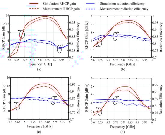 Figure 18 shows both the simulated and measured RHCP gains for each angle of beam tilt, along with the radiation efficiencies as functions of frequency. Figure 18a details the RHCP gains for the broadside series-fed array antenna at a of . Figure 18b–d show the RHCP gains for beam tilt antennas at = , , and , respectively, in the = plane. At the central frequency of 5.84 GHz, the measured RHCP gains of broadside series-fed array antenna, 15°, 30° and 45° beam tilt antennas are 14.59 dBic, 13.09 dBic, 12.07 dBic and 10.71 dBic, respectively, which closely align with the simulated RHCP gains of 15.52 dBic, 13.75 dBic, 12.99 dBic and 11.76 dBic in sequence. The radiation efficiencies of the antennas at 5.84 GHz range from 80.3% to 84.8% in measurements, and the simulated radiation efficiencies at 5.84 GHz are in the range of 81.9% to 86.0%. The highest RHCP gains and efficiencies are centered around the frequency of 5.84 GHz.