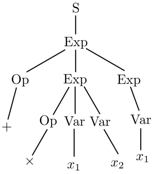 A context-free grammar has production rules in the form , where and . Context-free grammars provide a good compromise between the ability to express a language and efficiency and, therefore, are one of the most widely used grammar types in computer science. In G3P-SR, the genotype of the model terms in the individual is a derivation tree that shows how the model term can be derived from the CFG, as shown in Figure 1, where expressions Exp, operations Op, and variables Var. The initialization method used in G3P-SR is the probability tree creation 2 (PTC2) algorithm [], which follows the production rules to generate new individuals and ensures that they have a valid syntax.