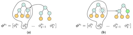 The mutation operator is a stochastic unitary operator that takes the individual and perturbs it to output a new individual. In subtree mutation, a parent tree is selected, a nonterminal node is selected, and a new tree is randomly generated with the root node of the randomly generated tree matching the nonterminal node selected from . The subtree below the selected node of is deleted and replaced with the newly generated tree. In point mutation, a terminal node is selected and replaced with another terminal node while making sure that the resulting offspring is syntactically correct. Figure 3 shows an illustration of subtree and point mutation.