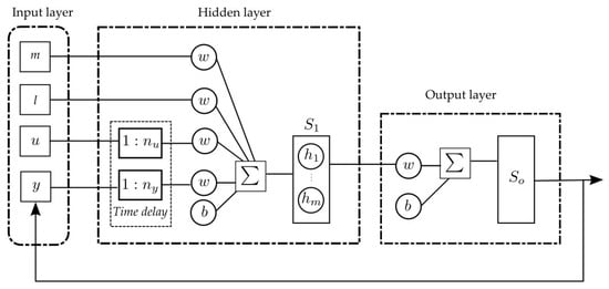 A nonlinear autoregressive neural network with exogenous inputs (NARX-NN) and Takagi-Sugeno fuzzy (TSF-ARX) models has been chosen in this study for a comparative analysis. The NARX-NN is a recurrent dynamic network with output feedback. The architecture of the NARX-NN model of the crane dynamic used for the comparative analysis is shown in Figure 5, where l and m are, respectively, the rope length and the mass of the payload transported by a crane, which indicate the current operating point of a crane system, while u and y are the input signal and the model response, respectively. The time-delayed normalized inputs and outputs are fed into the hidden layer, where a linear combination of inputs passes through an activation function. Throughout this work, the activation function has been chosen as the tangent-sigmoid function, while the output function is linear. The weights w and biases b have been optimized using the Levenberg–Marquardt algorithm. The optimization process is halted if the maximum number of epochs exceeds 1000, the gradient is less than 10−7, or the MSE on the validation data set increases six times consecutively.