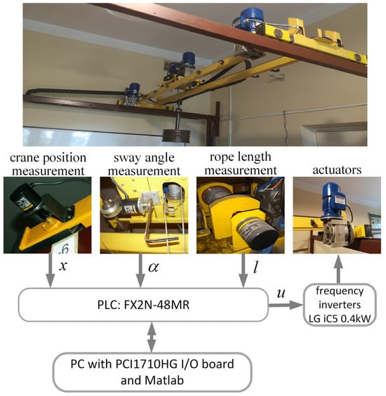 The data used in the identification procedure were obtained from experiments carried out on a laboratory double-girder crane mechanism. The mechanism was driven by two AC gear motors with a gear ratio of 15.5, operating at 1400 rpm and with an output power of 0.18 kW. The AC motors were supplied by two LG iC5 0.4 kW frequency inverters, controlled by a Mitsubishi FX2N series Programmable Logic Controller (PLC). The crane mechanism was equipped with the incremental encoders installed on the wheels to measure the position x relative to the crane bridge, under the trolley connected to a pair of fork arms within which the hoisting cable passed through to measure the sway angle α of the cable-suspended payload and on the drum of the lifting mechanism to measure the rope length l. The incremental encoders had a resolution of 400 pulses per rotation (ppr), 2000 ppr, and 100 ppr to measure the position x, sway, angle α, and rope length l, respectively. The data from the sensors were sampled at 10 Hz using a PC with 16 GB RAM and Quad Core 4 GHz Intel Core i7-6700K CPU running Windows 10 and Matlab R2020. The PLC was used during the experiments to transfer and convert the control and measurement signals exchanged between the PC with IO card and a plant. The control analog voltage signal u within the range ±10 V was sent from the PC with IO card to the PLC, which transmitted this signal to the frequency inverters converting it to the voltage signal 0–10 V and binary signals corresponding to a frequency change within the range 0–50 Hz and the direction of motor rotation, respectively. Figure 7 shows a view of the laboratory overhead crane and the data acquisition equipment used in the identification experiments.