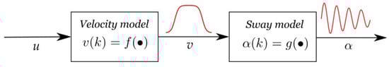 Overhead crane dynamic model composed of two submodels, denoted as velocity and sway models.