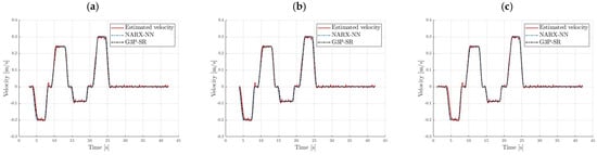 Prediction and simulation of crane velocity for testing data (operating point l = 1.1 [m], m = 50 [kg]): (a) 10-step-ahead prediction, (b) 20-step-ahead prediction, and (c) simulation.