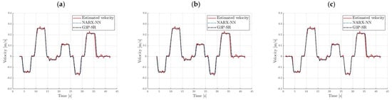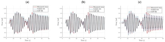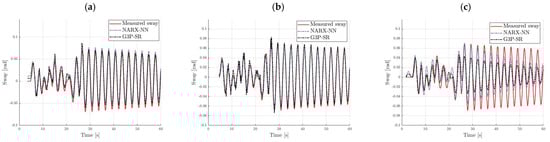 The G3P-SR algorithm was compared with the NARX-NN and TSF-ARX models. The number of input delays for both submodels, as well as the number of output delays for the velocity submodel of the NARX-NN (Figure 5), was chosen to be of the same order as that for the G3P-SR. The NARX-NN sway submodel required an additional delay , as the results with only four output delays were unsatisfactory. The structures of NARX-NN with three, four, and five hidden neurons were tested for the velocity model, while, for the sway model, the number of hidden nodes was chosen to be three, five, and six.