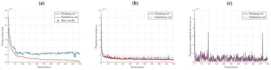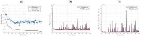 Sway model population statistics: (a) MSE for training and validation set, (b) population mean, and (c) population standard deviation.
