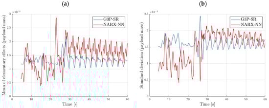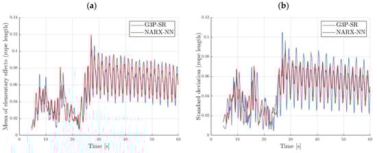 The mean and standard deviation of the elementary effects of the rope length and mass are displayed in Figure 19 and Figure 20, respectively. The mean of the elementary effect of the payload mass was greater in the NARX-NN model compared to the G3P-SR model, indicating that the G3P-SR model was more robust to changes in the payload mass. The mean of the elementary effect of the rope length was slightly larger in the G3P-SR model. In both cases, it was noticeable that the model was less sensitive during the transient state when the trolley was in motion and the residual oscillations were more sensitive to parameter changes. The mean of the elementary effect of both models was greater by about two orders of magnitude than that of the mean elementary effect of the payload mass; thus, we can conclude that both models are robust to changes in the payload mass. The standard deviation of the elementary effect of the rope length indicated there were more nonlinear effects in the G3P-SR model than in the NARX-NN model.