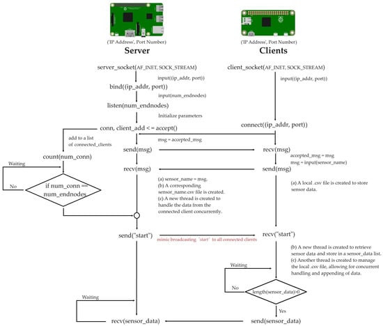 The wireless sensing platform proposed in this study consists of two key components: a centralized gateway implemented as the server socket and end nodes implemented as client sockets. The gateway is deployed on a Raspberry Pi 4 (RPi4), whereas the end nodes utilize Raspberry Pi Zero 2W (RPi0-2W) devices. Each individual end node is responsible for initiating a single client connection.