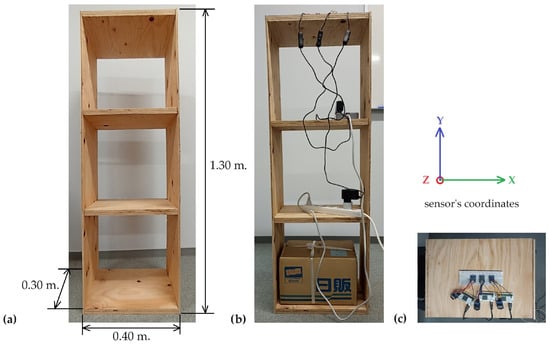 Three-Degree-of-Freedom (3DOF) wood system: (a) The more rigid structure with full side panels, (b) The less rigid structure with partition side panels (front view and side view, respectively), (c) Sensor at first storey, (d) Sensor at second storey, and (e) Sensor at third storey.