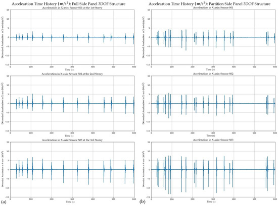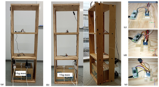 Specifically, in the experimental setup, each RPi0-2W sensor node was carefully placed on a designated storey of the more rigid structure, which was distinguished by its full side panels (shown in Figure 5a). The sensor placement was intentionally altered at the center of each storey. Moreover, while the sensors were positioned at the same location, the partition side panel was used instead of the full side panel (shown in Figure 5b). To ensure secure attachment, commercial adhesive tape was employed to firmly affix the breadboard containing each sensor. The structural responses were captured by collecting data from the x-axis of the sensor nodes, as depicted in Figure 5c–e.
