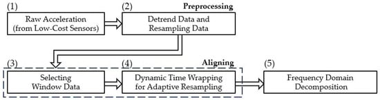 Figure 6 presents the schematic diagram of FDD process applied to raw low-cost acceleration data. The FDD scheme consists of five steps: (1) reading the raw data, (2) detrending and resampling the data, (3) selecting a window size that contains the impulse response, (4) refining the alignment using adaptive sampling DTW, and (5) performing the FDD analysis.