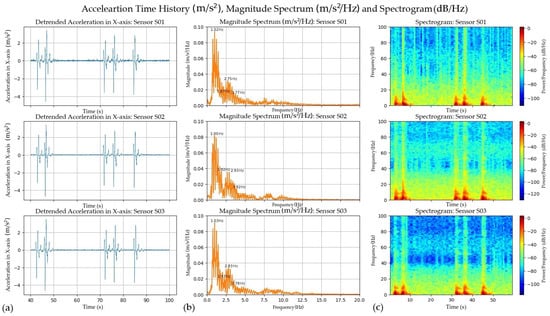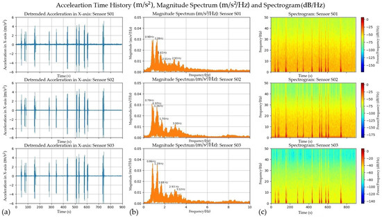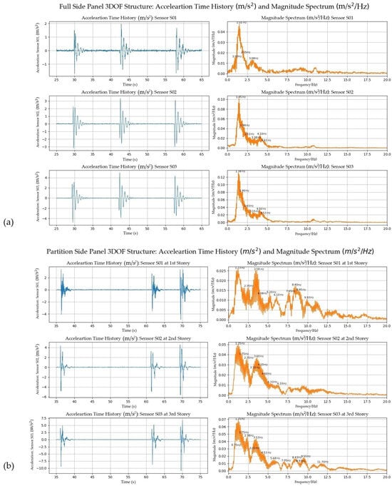 During the experimental sessions, the wood 3D structure was subjected to several impact loadings. To ensure the robustness and reliability of the findings, each data recording session lasted approximately 15 min to ensure an adequate experimental period. This collection of 3DOF structural responses from both sensor placement schemes allows for a comparative analysis to evaluate the quality of the collected data in terms of modal analysis results. Such analysis enables an assessment of the effectiveness and reliability of the collected data in capturing the structural response and modal characteristics of the system.