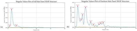 The first experimental investigation focused on a 3DOF system constructed from wood, with dimensions measuring 0.40 × 0.30 × 1.30 m, as depicted in Figure 4a. Wood was specifically chosen as the material for the 3DOF structure due to its characteristics, including lower stiffness and density compared to alternative materials such as light metals. Consequently, the wood structure exhibited a lower natural frequency. Additionally, the viscoelastic nature of wood imparted inherent damping properties, enabling effective energy dissipation and vibration reduction, thereby resulting in higher damping characteristics.