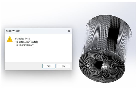 The 3D CAD model was saved in STL form (Figure 2), which creates a solid model using a triangle mesh. The created model was approximated using 1440 triangles. The parameters of the STL file are: linear deviation—0.002 mm, and angle—1°.