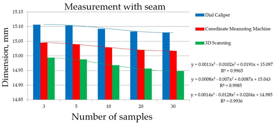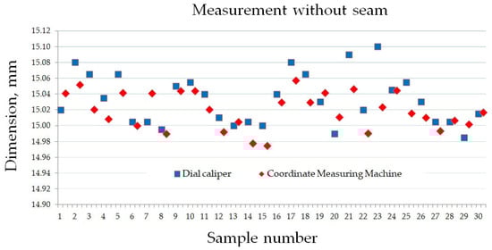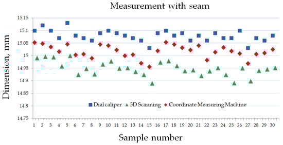 Analyzing the overall test results for 30 samples measured by the three methods, it can be seen that in the case of samples where the longitudinal seam was included in the measurements, the smallest values were registered for the measurement method using a 3D scanner, where the obtained average value was 14.95 ± 0.011 mm. In the next order, the obtained results were as follows: CMM 15.02 ± 0.01 mm, Dial Caliper 15.08 ± 0.008 mm. Thus, we obtain an average result differing by as much as 0.13 mm, where such a large difference is only due to the measurement method used.