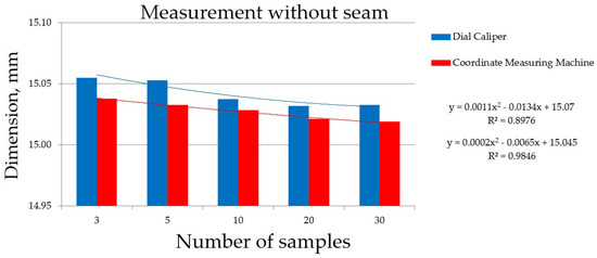 Analyzing Figure 11 and Figure 12 on the effect of the number of samples tested on the value of the result and its statistical interpretation, it can be concluded that in both the variants without and with seam, the average value of the diameters decreases with the increase of the analyzed population and stabilizes at a similar level already for 20 analyzed samples. The largest difference occurs for the test with seam using 3D scanner measurement. Table 3 and Table 4, for all samples tested and the methods used, clearly show that for 20 samples, the average values have the same values as for the measurement of all 30 samples. Moreover, not only the average value stabilizes with 20 tested samples, but also the expanded uncertainty. In the case of Figure 12 (seamless measurement) and the corresponding Table 4, the average values for 20 and 30 samples have the same values: 15.03 mm (caliper) and 15.02 (CMM), and the difference in the expanded uncertainty between both series is only 0.02 and 0.03 mm, respectively. Comparing the expanded uncertainty values for a series of 10 and 20 measurements, these differences are 0.07 mm (caliper) and 0.04 mm (CMM), respectively. The quantitative interpretation of the test results for measurements depending on the number of samples is shown in Table 3 and Table 4.