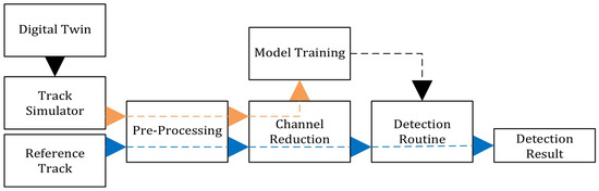 Figure 2 delineates the architecture of the developed methodology, with each segment receiving a detailed exposition in the subsequent chapters of this document. Initially, a digital twin representation is created and utilized within the track simulator to generate synthetic data, as detailed in Section 2.2 and Section 2.3, respectively. These synthetic data, alongside empirical data collated from a reference track, detailed in Section 2.5, are both subjected to a unified process of pre-processing and channel reduction, described in Section 2.4 and Section 2.7. The refined artificial data from this process are instrumental in the training of an object detection model, elaborated in Section 3.3, which is integral to the subsequent detection routine, explored in Section 2.9.