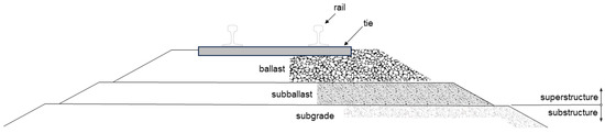 The substructure of a railway track is generally divided into several layers [14], as illustrated in Figure 5. The top layer consists of coarse-grained ballast, in which the sleepers are embedded. Beneath it is the subballast layer, which serves as a separating layer to prevent the mixing of the ballast bed with the bottom layer, the subgrade, and provides drainage. This layered structure was used as a basis for the simulation and replicated in the simulation environment, with the resulting simulation environment being depicted in Figure 6. It is noted that the ballast was modeled separately, where each individual ballast grain was generated randomly and piled up through physics-based simulation. Additionally, the subgrade layer consisted of a soil model with varying degrees of moisture, thus replicating diverse subballast conditions.