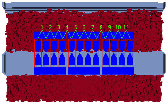 Beyond the standard track and sleepers in each section, the substructure can incorporate extra objects with customizable material properties. Not being limited to basic shapes like cuboids, cylinders, and spheres, it also supports the integration of digital design files, regardless of size and complexity. The antennas were based on the digital twin of a ground-penetrating radar system, as described in Section 2.2. They were inserted in triplicate in the middle in the direction of travel and a defined transverse offset, so as depicted in Figure 7, a total number of 11 channels were available for evaluation by default.