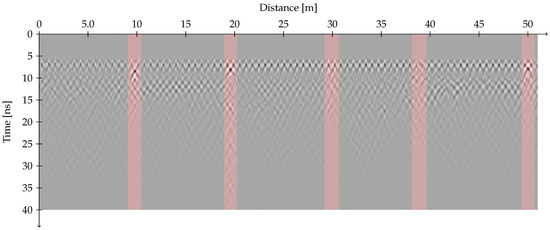 Section of real measurement data 0 to 51 m. Areas with buried objects are marked in red.