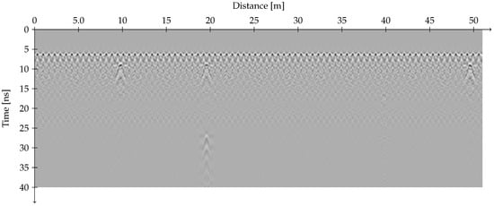 In this work, predominantly short track sections of a few meters were created, where a “wow” in the above sense generally does not pose a problem. However, low-frequency signal components along the path axis did occur in the form of antenna crosstalk. Figure 9a,b first show an unprocessed B-scan and then the result after applying the dewow filter. While the unprocessed B-scan (see Figure 9a) is dominated by antenna crosstalk, the latter is completely removed in the filtered B-scan (see Figure 9b).