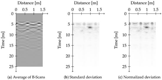 Applied to each data point across the individual channels, differences between the channels are emphasized. This particularly highlights reflections in the subgrade, which only occur in individual channels, such as smaller objects in the ground radar’s measurement range (see Figure 12b).