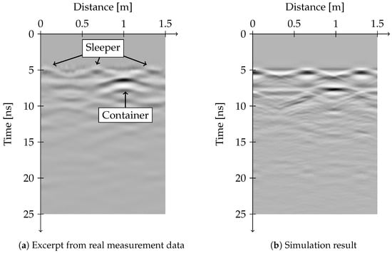 The measurement was conducted on a railway siding using a GPR antenna of type AM200 from the manufacturer IDS GeoRadar s.r.l., Pisa, Italy. This antenna was mounted 8 cm above the sleepers on a measuring cart and moved evenly along a track distance of 51 m. Individual measurements were triggered every 2 cm by using a distance-measuring wheel. Various objects were buried at defined distances along the track, as listed in Table 2. In addition, there were concrete sleepers spaced 65 cm apart on the track extending across the entire measurement area. To facilitate a good comparison between the reference track and the simulated data, both the real and simulated data were processed by using the same methods described in Section 2.4.