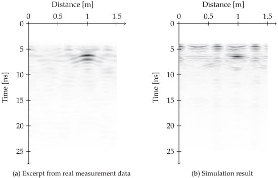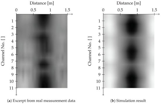 A mere examination of the B-scans already reveals a high degree of similarity, although the sleepers in the simulated data appear somewhat clearer. This can be attributed to slight differences in the assumed and actual material properties. When comparing the normalized deviation, shown in Figure 14b, the reflection components of the sleepers are also overemphasized. This effect suggests a deviation of the antenna model from the real antenna.