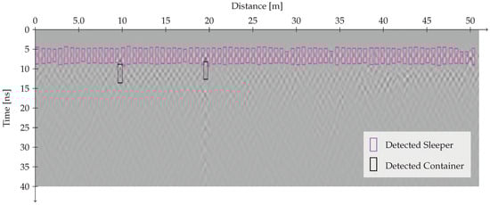 All data underwent pre-processing to be properly formatted for the neural network training of YOLO. For the scope of this work, the dataset was limited to 20 simulated track sections of 1 each. Future investigations, however, can use the present research as a basis and expand the dataset analogously. This led to the decision to initially distinguish between only two classes: the railroad sleepers and the buried containers. Figure 16 shows a dataset that was reduced to three channels by using the approach described in this paper. To expand the overall dataset, the methods of data augmentation described in Section 2.8 were relied upon. This resulted in a dataset of 56 sleepers and 40 metal containers underground which was used for training.