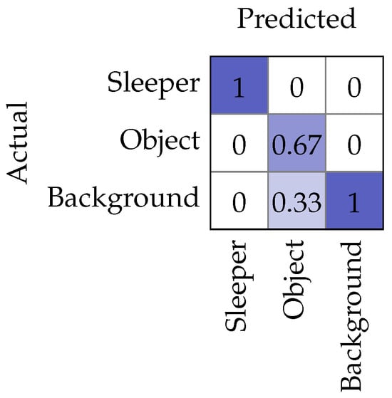 This is also evident when looking at the confusion matrix (see Figure 18), which shows a 100% recognition rate. While the precision for buried objects is also 100%, the recall rate is only 66%. However, due to the uneven distribution of classes, the resulting average precision of 83% is of limited significance. Some variability is also evident in the dimensions and positions of the labels, reflected in an average IoU value of 61% for sleepers.