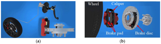 The main purpose of braking systems is to achieve the required braking torque, which causes the wheels to slow down and therefore brake. Today, most cars are equipped with the brake disc–pad system (Figure 1a) on both the front axle and the rear axle.