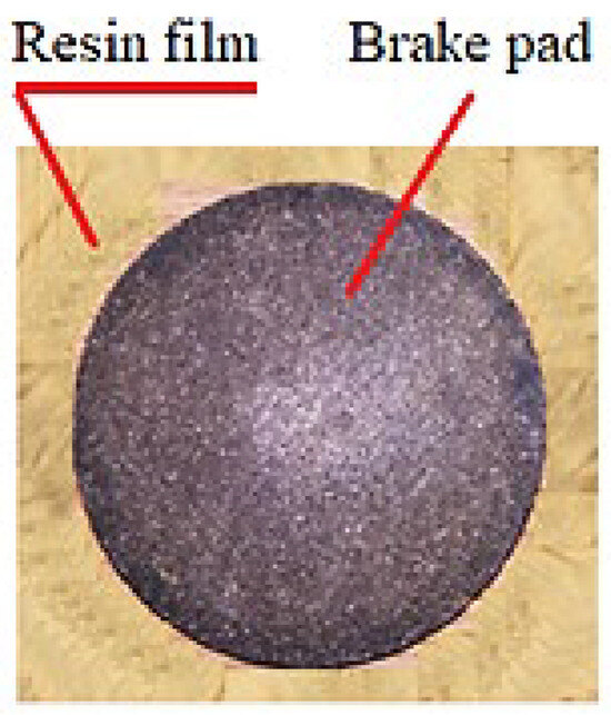 The samples from the brake pad and disc to be analyzed by microscopy were introduced in a resin matrix with a hardener and mixed in a special bowl. During mixing, a thin resin film is deposited on the material sample surface (from the analyzed brake pads, Figure 3). For optimal conditions, microscopic analysis was necessary to remove the resin film (Figure 4) by sanding and polishing, with the help of a Tegramin 25 (Struers Inc., Struers LLC, Cleveland, OH, USA).