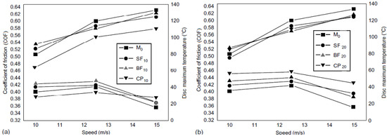 Effect of velocity on the COF of various metallic friction materials with 10 wt.% (a) and 20 wt.% (b): M0—metal-free reference material; SF—steel fiber; BF—brass fiber; CP—copper powder. Index 10 si 20 represents the metal amount in weight (10 wt.% and 20 wt.%).