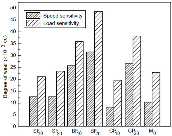 In the case shown in Figure 9, the material with 10 wt.% metal (here copper (Cu)) had less wear than the reference material (metal-free, M0) in both test conditions at load and speed. Instead, the material with 20 wt.% Cu had double the wear volume.