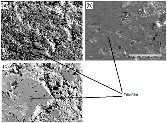 The surfaces (Figure 10) of materials M0, CP10, and CP20 under electron microscopy show significant morphological and topographical differences, which are correlated with the reduction in the COF and the rate of wear. However, since the wear debris is much smaller than in the other cases, where the wear rate is low, the plateaus are not very extensive.