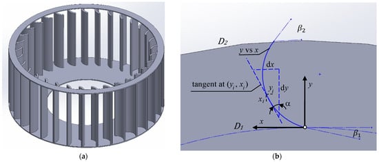 The impeller model consists of two lower and upper discs, with 33 blades arranged between them. In conformity with the genuine fan design, the overall impeller height measures 60 mm. During geometry optimization, angles and (which represent the vane’s leading and trailing angle, respectively) are considered parametric model elements that can be adjusted. The values for and are considered fixed at 116 mm and 140 mm, respectively. As these values remain constant, the model possesses an adequate number of parameters to effectively define the blade’s shape (Figure 2).