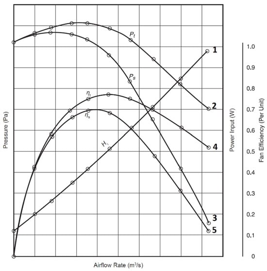 “RG14R-4IO.Z8.4R” performance curves of a centrifugal fan (Ziehl-Abegg SE []). Here reference curves are numbered from 1 to 5.