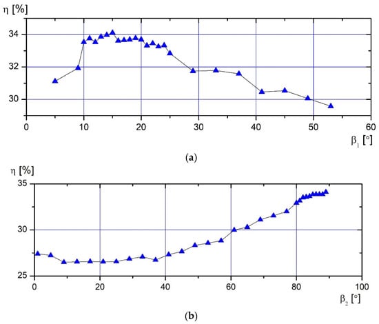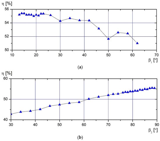 Leading- and trailing-angle influence on full efficiency at 1st design point (DP): (a) influence of angle ; (b) influence of angle .